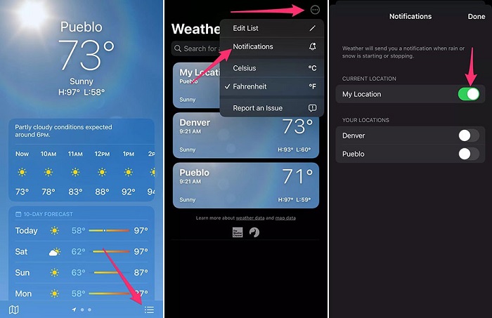 Tiếp theo, bạn chạm vào biểu tượng hình tròn có ba dấu chấm ở góc trên cùng bên phải của màn hình, sau đó là Notifications. Bật tùy chọn My Location và nhấn Done. Khi trời sắp có mưa, iPhone của bạn sẽ thông báo một vài phút trước khi trời bắt đầu mưa. Bạn cũng sẽ nhận được một cảnh báo khác khi mưa gần kết thúc.
