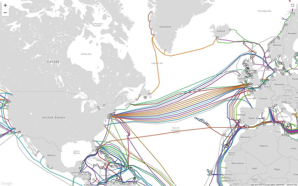 Sơ đồ các tuyến cáp nối giữa Mỹ và châu Âu thông qua Đại Tây Dương. Ảnh: TeleGeography.