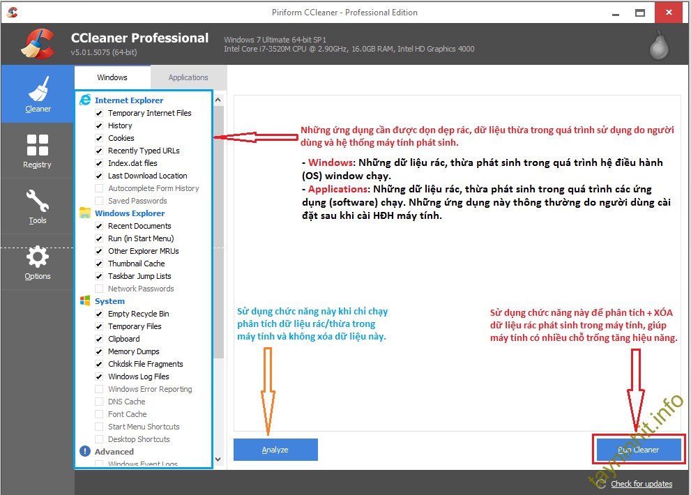 CCleaner có nhiều tiện ích và chức năng nhưng ở nội dung bài này chúng tôi xin hướng dẫn gói gọn các bạn hai phần chính bên dưới: