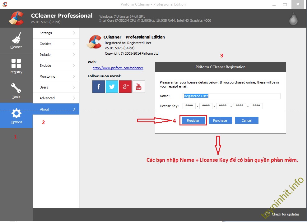 - Bước 3: Đăng ký bản quyền phần mềm bằng cách vào Options --> About --> Register --> Nhập key (Trong trường hợp sử dụng bản free thì không cần đăng ký bản quyền)
