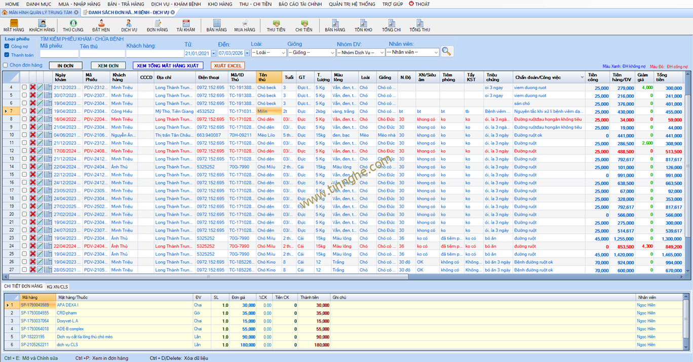 Danh sách đơn hàng khám, chữa bệnh cho phép lọc dữ liệu theo các tiêu chí khác nhau: Ngày tháng, Mã, Thú , loài, giống, Nhóm dịch vụ, nhóm bệnh, bác sỹ.