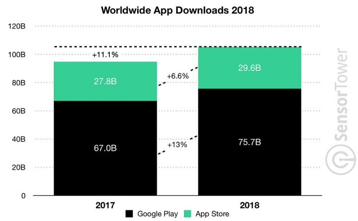 Trong năm 2018 vừa qua, lượt cài đặt ứng dụng đã lần đầu vượt mức 105,3 tỷ lượt, tăng 11,1% so với năm 2017. Chợ ứng dụng Google Play Store ghi nhận lượt tải lên tới 75,7 tỷ lượt trong khi App Store chỉ ghi nhận lượt tải là 29,6 tỷ lượt.