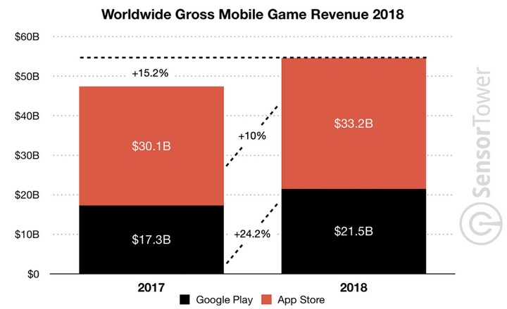 Cuối cùng là thống kê doanh thu game trong tổng doanh thu từ ứng dụng di động. Một lần nữa App Store lại minh chứng là cỗ máy thu tiền tốt thứ hai sau iPhone. Doanh thu từ game di động trên App Store trong năm 2018 đạt tới 33,2 tỷ USD trong khi Play Store chỉ là 21,5 tỷ USD. Tổng doanh thu từ game di động trên toàn cầu là 54,7 tỷ USD.