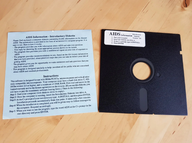 Thời điểm đó, 20.000 người tham gia hội nghị về AIDS của Tổ chức Y tế Thế giới (WHO) nhận được đĩa mềm gửi bởi PC Cyborg Corp, cùng tờ giấy ghi rằng bên trong đĩa chứa chương trình tương tác để tìm hiểu về AIDS.
