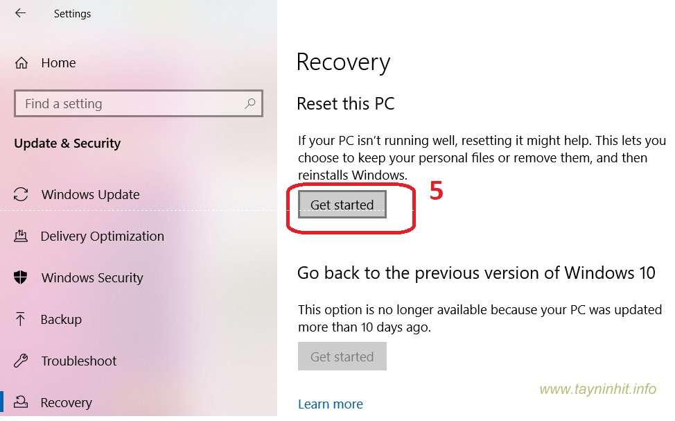 - Bước 4: Tiếp theo, ở khung bên phải cửa sổ, click vào Get Started trong mục Reset this PC