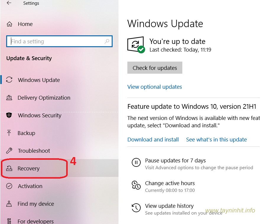 - Bước 3: Click chuột vào Recovery từ khung bên trái cửa sổ.