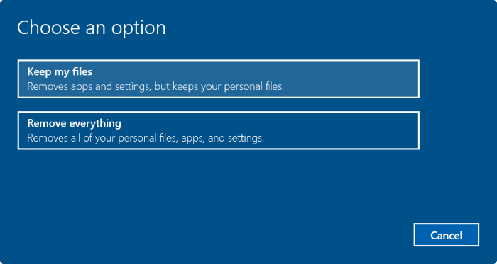 - Bước 5: Trong hộp thoại Choose an option hiển thị, bạn sẽ nhìn thấy 2 tùy chọn Keep my files và Remove everything