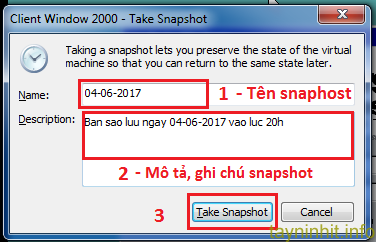 - Bước 2: Hộp thoại Take Snaphost mở ra, bạn đặt tên và mô tả cho Snapshot, sau đó click chuột trái vào nút "Take Snapshot" và chờ trong khoảng 1 phút để VMware thực hiện.