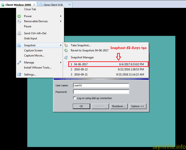 VMware hỗ trợ người dùng tính năng Snapshot, với tính năng này sẽ giúp người dùng có thể backup lại hiện trạng của máy ảo và khôi phục nó trở lại khi người dùng muốn. Việc này sẽ rất hữu ích khi bạn cấu hình các dịch vụ trên máy ảo mà gặp sự cố, có thể khôi phục hệ thống một cách dể dàng vì Snapshot là một tính năng rất hay của Vmware, ý nghĩa cụ thể của nó như sau: