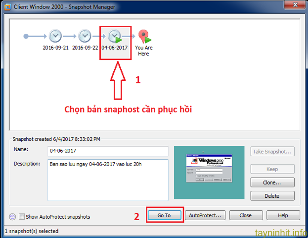 - Bước 2: Chọn Snapshot bạn muốn phục hồi đã sao lưu trước đó, sau đó click chuột trái "Go to"