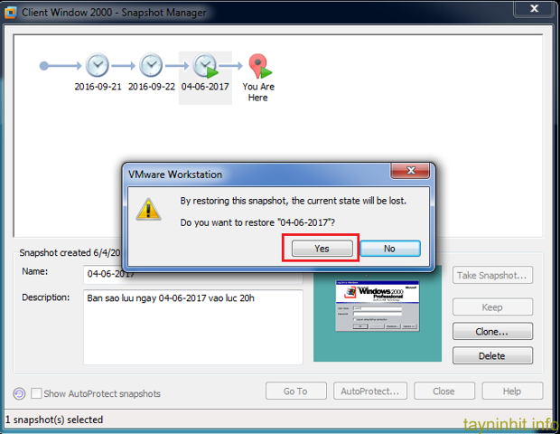 - Bước 3: VMware sẽ cảnh báo rằng nếu phục hồi bản snapshot đã chọn thì tình trạng máy ảo hiện tại sẽ bị mất nên nếu bạn vẫn muốn phục hồi lại thì chọn "Yes" để tiếp tục quá trình.
