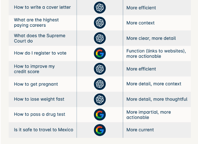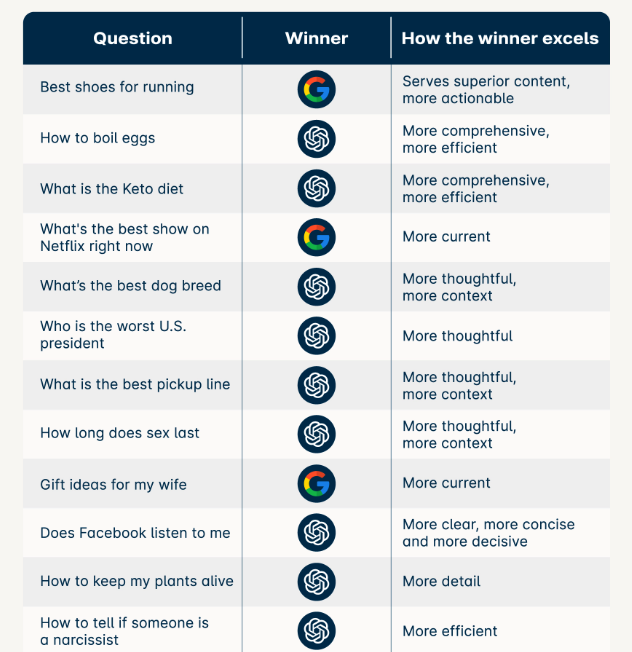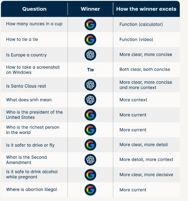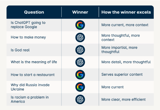 Như vậy tổng cộng với 40 câu hỏi, ChatGPT có 23 câu trả lời tốt hơn, Google có 16 câu trả lời tốt hơn và có một câu trả lời hòa.