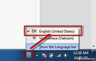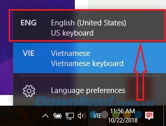 - Cách khắc phục: Rất đơn giản, bạn chỉ cần nhấn tổ hợp phím chuyển đổi ngôn ngữ của bộ gõ tiếng Việt (ALT + SHIFT hoặc click chuột trái vào biểu tượng VIE rồi chuyển nó về ENG - English) là được (hình bên dưới).