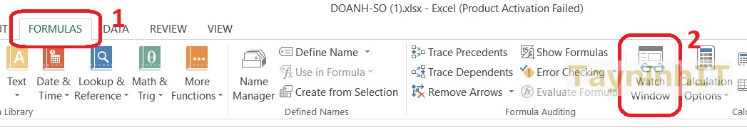 - Bước 1: Trước hết hãy bôi đen toàn bộ bảng dữ liệu > Formulas trong thanh Ribbon rồi nhìn xuống nhóm bên dưới > Watch Window.