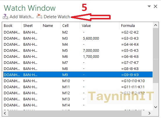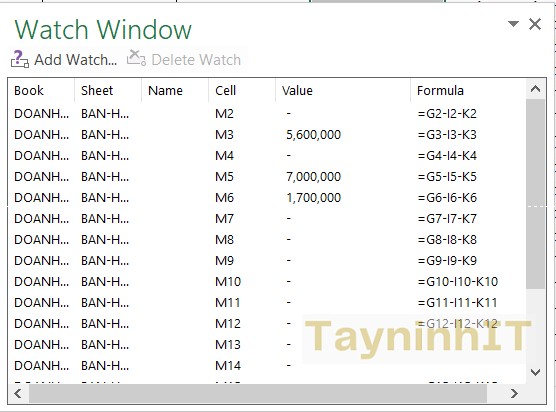 Đây là công cụ Watch Window trong Excel, có tính năng quản lý các công thức Excel trong 1 cửa sổ, kèm theo đó là kết quả hiển thị để chúng ta biết ngay được. Như vậy người dùng sẽ linh hoạt hơn trong việc quản lý bảng dữ liệu Excel.