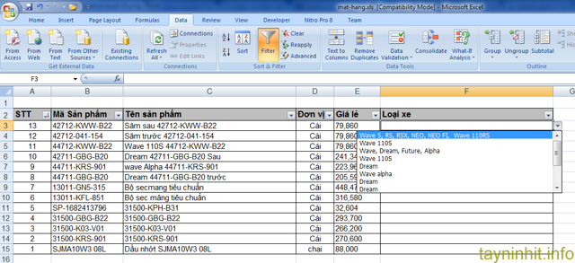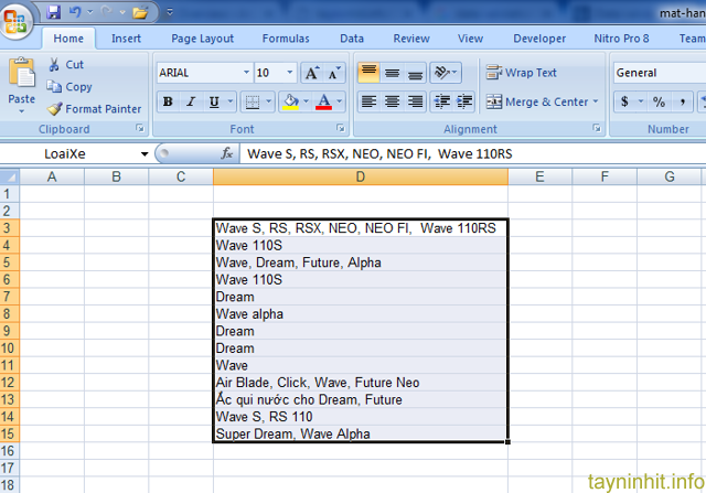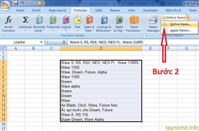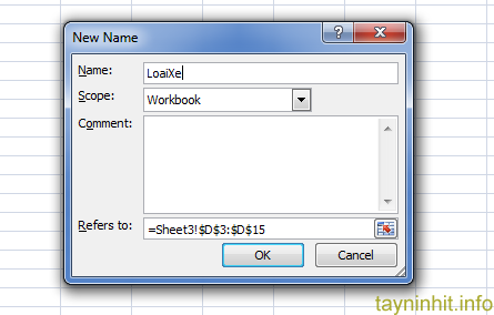- Bước 2: Đặt tên cho vùng dữ liệu vừa chọn: Tại tab Formula chọn ‘Define Name’ (hoặc dùng tổ hợp phím Alt + M + M + D) –> Đặt tên tại ô ‘Name’ với tên bất kỳ (ở đây tôi đặt là LoaiXe)