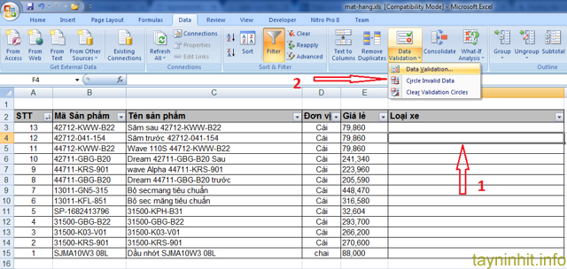 - Bước 3: Tạo Data Validation cho ô dữ liệu được chọn bằng cách đặt con trỏ chuột tại ô muốn xuất hiện danh sách, kế đến vào tab Data > Data Validation
