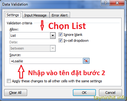 - Bước 4: Hộp thoại Data Validation xuất hiện, ở Allow > List, cột Source nhập tên ở bước 2 (LoaiXe)