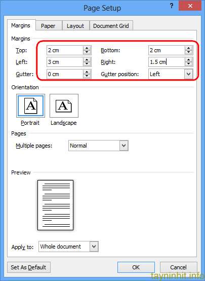 Vào Page Layout > Chọn Margin > Chọn Custom Margins... để chọn các kích thước canh trái, canh phải theo yêu cầu