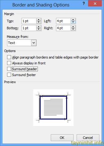 3. Chọn vào nút Options… , tại mục Mesure from chọn Text, đánh dấu bỏ hết các tùy chọn ở phía dưới để trang bìa được canh vào sát lề trang in