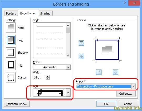 5. Vào Page Layout, chọn vào nút Page Borders, trong hộp thoại Page Borders, tại mục Art, chọn kiều khung viền có sẵn là đường kẻ to nhỏ song song  (như hình), tại mục Apply To: Chọn This Section: First page only để word chỉ tạo khung cho duy nhất trang đầu tiên mà thôi