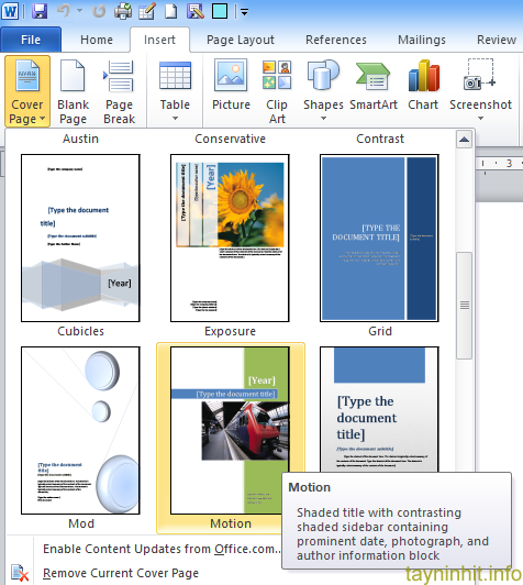 2. Vào Insert chọn Cover Page, sau đó chọn một mẫu tùy ý có sẵn