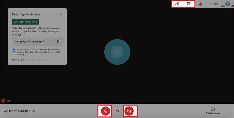4.1 Copy đường link ở khung bên trái để gửi link cho người dùng máy tính hoặc copy mã lớp học là các ký tự ở sau cụm meet.google.com/ để gửi mã lớp cho người dùng điện thoại.