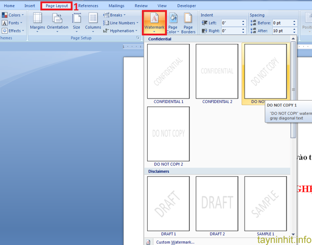 Bước 1: Các bạn mở tài liệu word muốn chèn thêm watermark và chọn tab Page Layout > Watermark trên thanh menu của Microsoft Word 2007/2010.