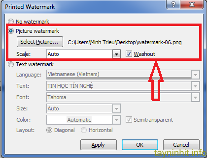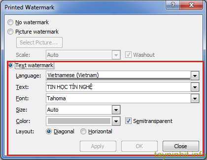 Hộp thoại Printed Watermark xuất hiện các bạn chọn Text watermark và thiết lập một số thông tin.