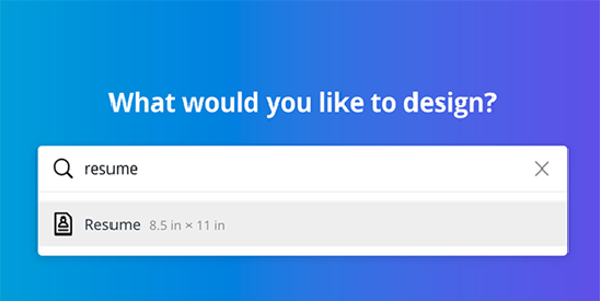 Đầu tiên, nhập Resume vào thanh tìm kiếm. Bạn sẽ thấy một danh sách các mẫu thiết kế được tạo sẵn, nhưng bạn đang tìm kiếm một trang trống ở trung tâm. Cụ thể, bạn muốn Canva chọn kích thước cho CV bạn là: 8,5 x 11 inch. Chọn định dạng trước này giúp bạn tránh những rắc rối khi bạn chọn tự thiết kế CV của mình.