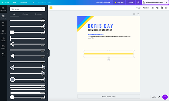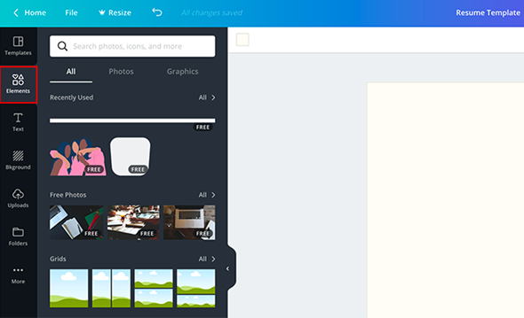 Tiếp theo, nhấp vào Elements menu để tìm các hình dạng, đường và đồ họa mà bạn có thể sử dụng để làm nổi bật CV của mình.