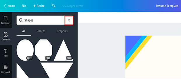 Để thoát menu Shapes và quay lại Elements, nhấp vào x trong thanh tìm kiếm.