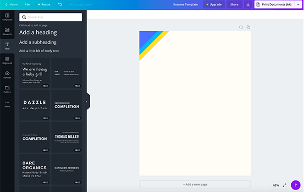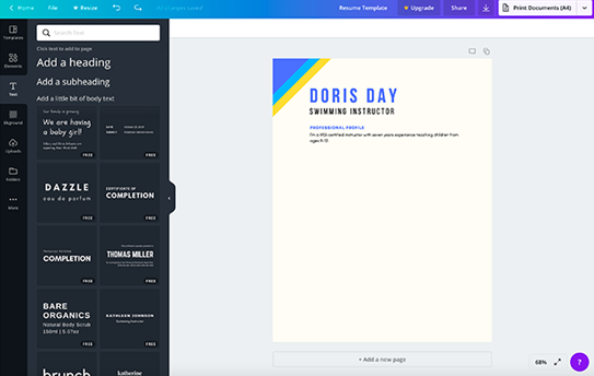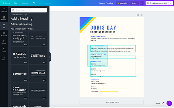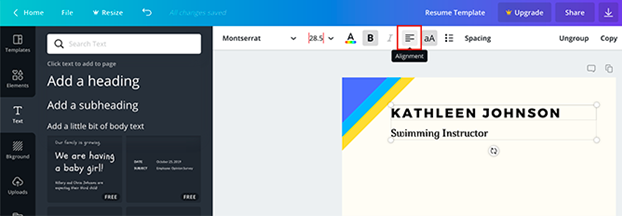 Sau khi bạn hoàn tất bước Elements, nhấp vào Text. Bạn sẽ thấy có một số cách khác nhau để chèn nội dung bằng văn bản vào sơ yếu lý lịch của bạn.