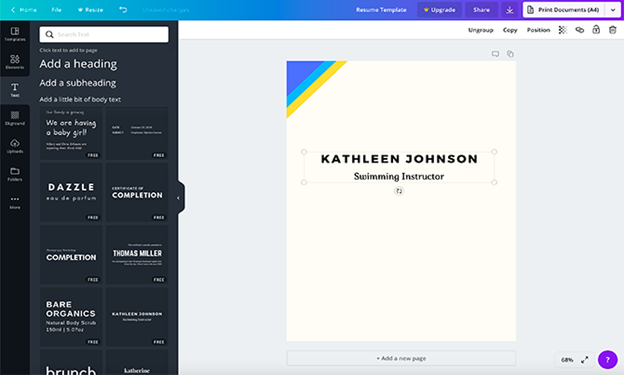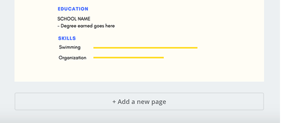 Đầu tiên, chọn Text > Add a bit of body text. Nhập tên kỹ năng của bạn, trong trường hợp này là “Swimming”. Sau đó định vị hộp văn bản trên trang.