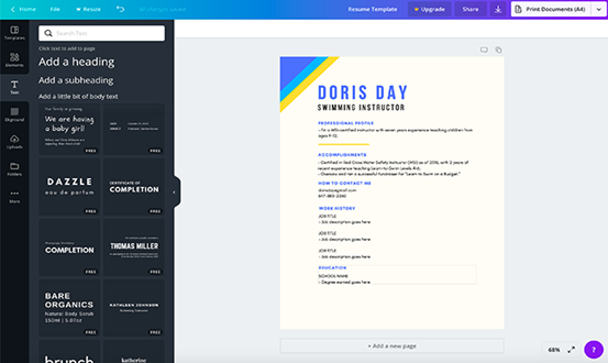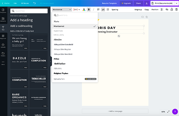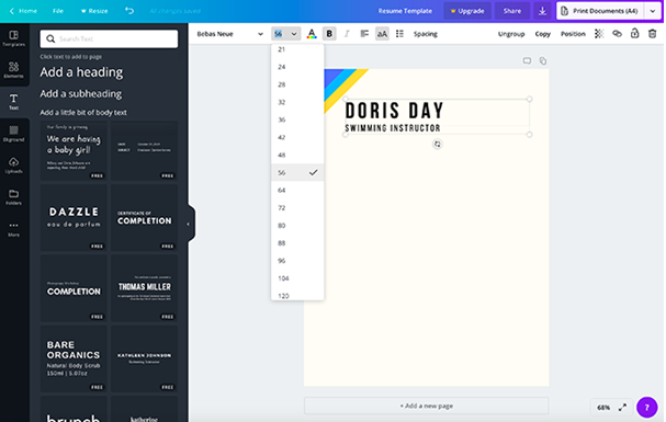 Canva tạo ra các combo tiêu đề / phân nhóm cho các loại tài liệu khác nhau. Bạn cũng có thể chọn chèn một tiêu đề (heading), tiêu đề phụ (subheading) hoặc nội dung văn bản (body text). Trong ví dụ này, mình đã sử dụng kết hợp tiêu đề / tiêu đề phụ, nhưng như bạn có thể thấy nó quá lớn cho tiêu đề vá nó cũng ở sai vị trí.