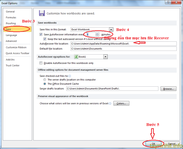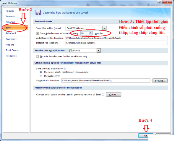 - Bước 2: Chọn Save ở dòng Save Autorecover information every ta chọn thời gian phù hợp cần lưu tự động -> OK