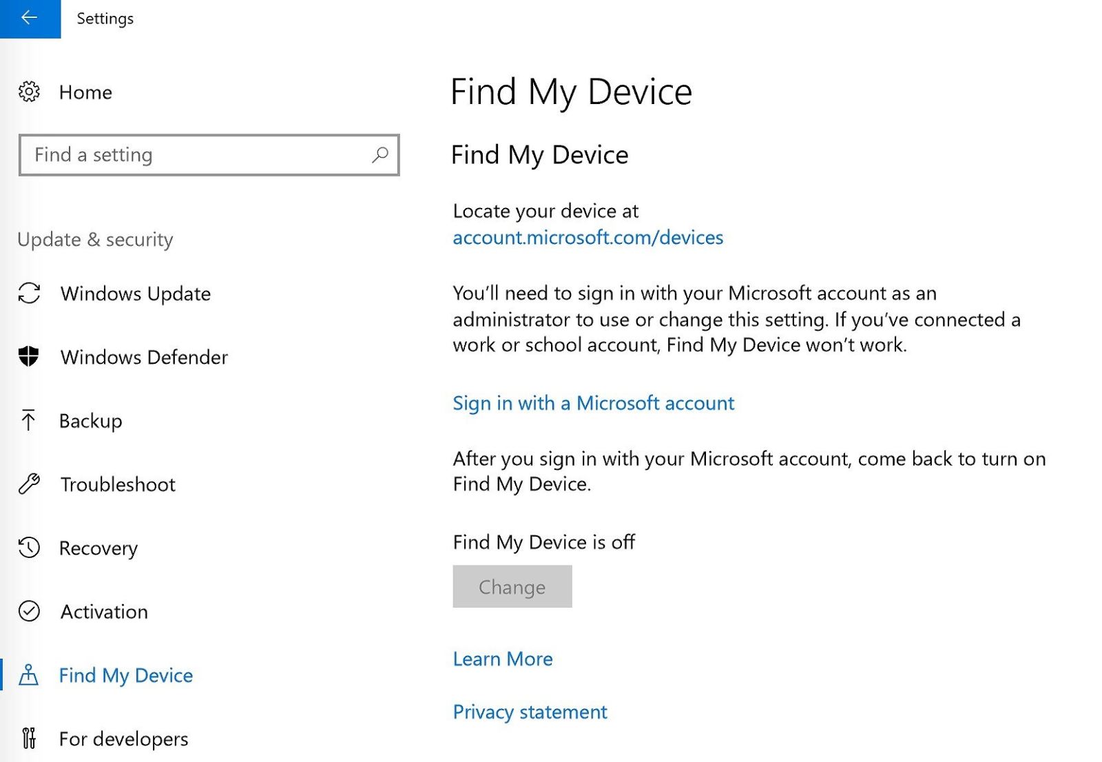 Thật may mắn, cả Android lẫn iOS đều được tích hợp sẵn tính năng Find my phone (tìm thiết bị), giúp người dùng xác định vị trí thiết bị dễ dàng hơn theo thời gian thực. Tất nhiên Microsoft cũng không ngoại lệ khi đã bổ sung thêm tính năng Find My Device cho người dùng Windows 10. Để kích hoạt, trên laptop bạn hãy bấm vào menu Start và chọn Settings > Update & Security > Find My Device. Lưu ý, tính năng định vị chỉ hoạt động được khi bạn đăng nhập bằng tài khoản Microsoft hoặc Outlook, không áp dụng cho tài khoản cục bộ.