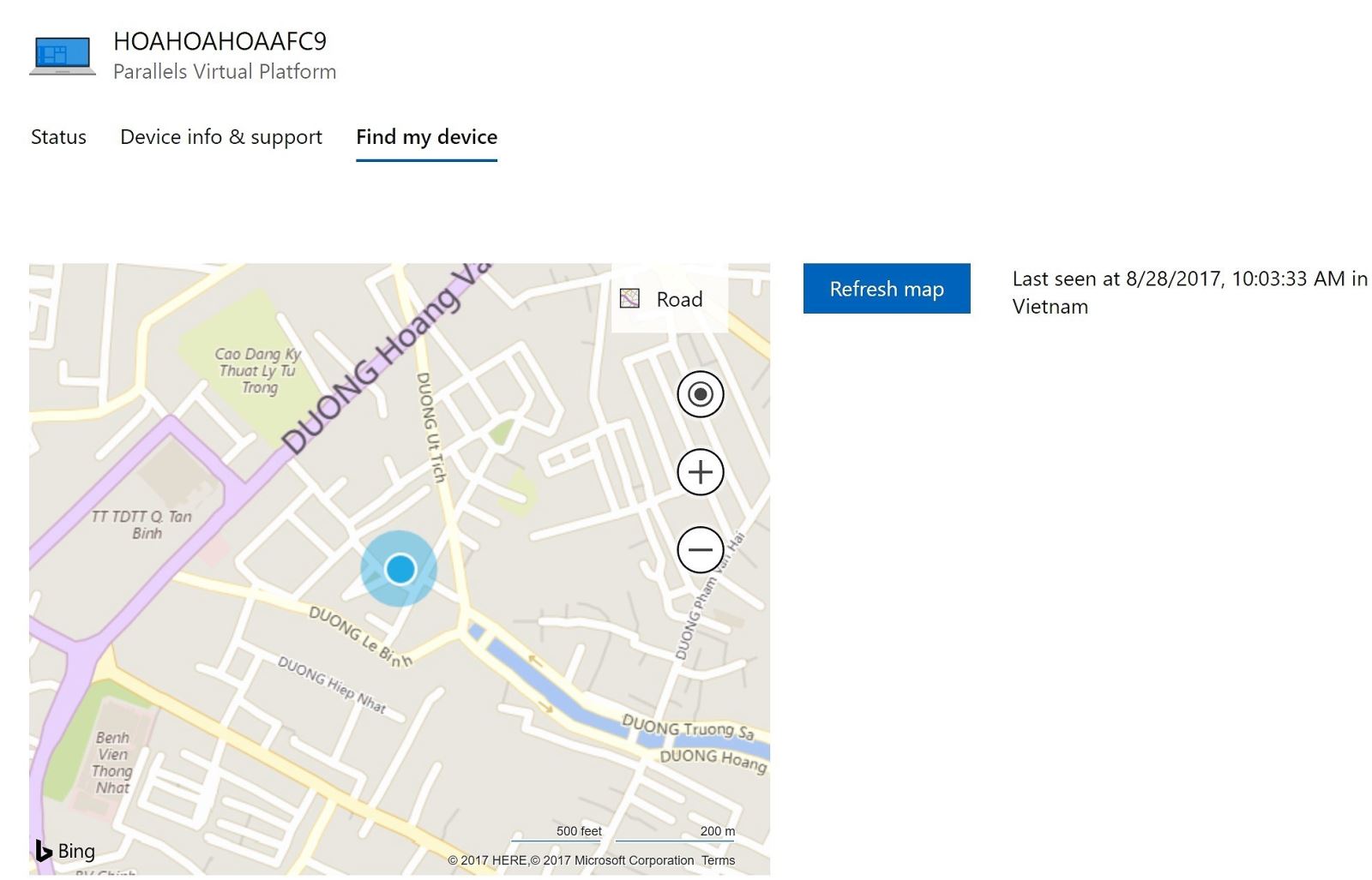 https://account.microsoft.com/devices và đăng nhập bằng tài khoản tương ứng trên thiết bị. Tại đây sẽ bao gồm danh sách các thiết bị đang sử dụng và một số thông tin liên quan. Tùy chọn Find my device cho phép bạn xác định vị trí thiết bị theo thời gian thực trên bản đồ. Lưu ý, vị trí thiết bị sẽ liên tục được cập nhật khi người dùng kết nối mạng.