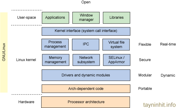 Sơ đồ trên chỉ ra các thành phần quan trọng. Tầng cuối cùng chính là một tập hợp mã kiến trúc giúp Linux có thể hỗ trợ đa nền tảng phần cứng (ARM, PowerPC, Tilera TILE v.v...). Tất nhiên, chức năng này được đăng ký theo giấy phép GNU, tạo nên tính di động của Linux.