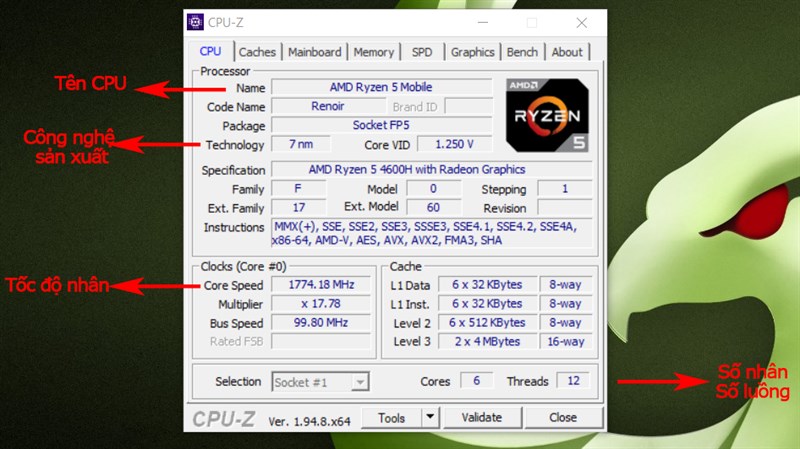 - Thẻ CPU: Cung cấp đầy đủ các thông tin về CPU với các số cơ bản bao gồm tên bộ vi xử lý, nguồn, các package, công nghệ, thông tin kỹ thuật, model, cache, bus, tốc độ luồng,…
