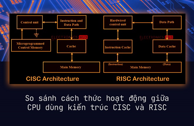 Trong khi kiến trúc CISC (Complex instruction set computer – máy tính với tập lệnh phức tạp), như CPU của Intel và AMD, hướng đến việc thực hiện tác vụ trong ít dòng lệnh nhất có thể, nên các tập lệnh phức tạp được nhúng trong CPU, giúp con chip hiểu và thực hiện được nhiều tác vụ cơ bản trong vài chu kỳ CPU. Do vậy, hệ thống cần ít RAM để lưu trữ các câu lệnh hơn, các câu lệnh phần mềm cũng ngắn hơn, nhưng lại khiến cấu tạo CPU rất phức tạp, do cần nhiều bóng bán dẫn để lưu trữ các tập lệnh này.