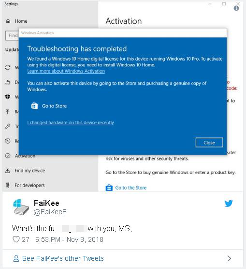 Đối với những người gặp phải lỗi này, hệ thống của Windows 10 có thông báo rằng: “Chúng tôi tìm thấy bản quyền kỹ thuật số của Windows 10 Home trên thiết bị đang chạy Windows 10 Pro. Để kích hoạt bản quyền kỹ thuật số này, bạn cần cài đặt lại phiên bản Windows 10 Home trên thiết bị. Hoặc bạn có thể mua bản quyền Windows 10 Pro từ cửa hàng Microsoft Store”.
