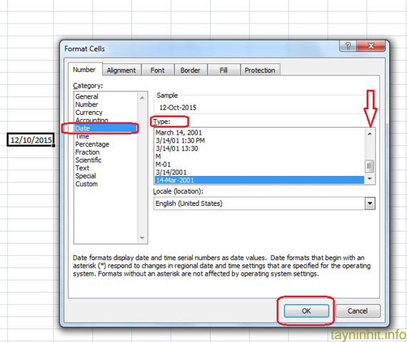 - Hộp thoại Format Cells hiện ra, trong tab Number chọn Date (định dạng ngày tháng) và chọn kiểu định dạng ngày tháng trong mục Type phù hợp với mục đích sử dụng của mình